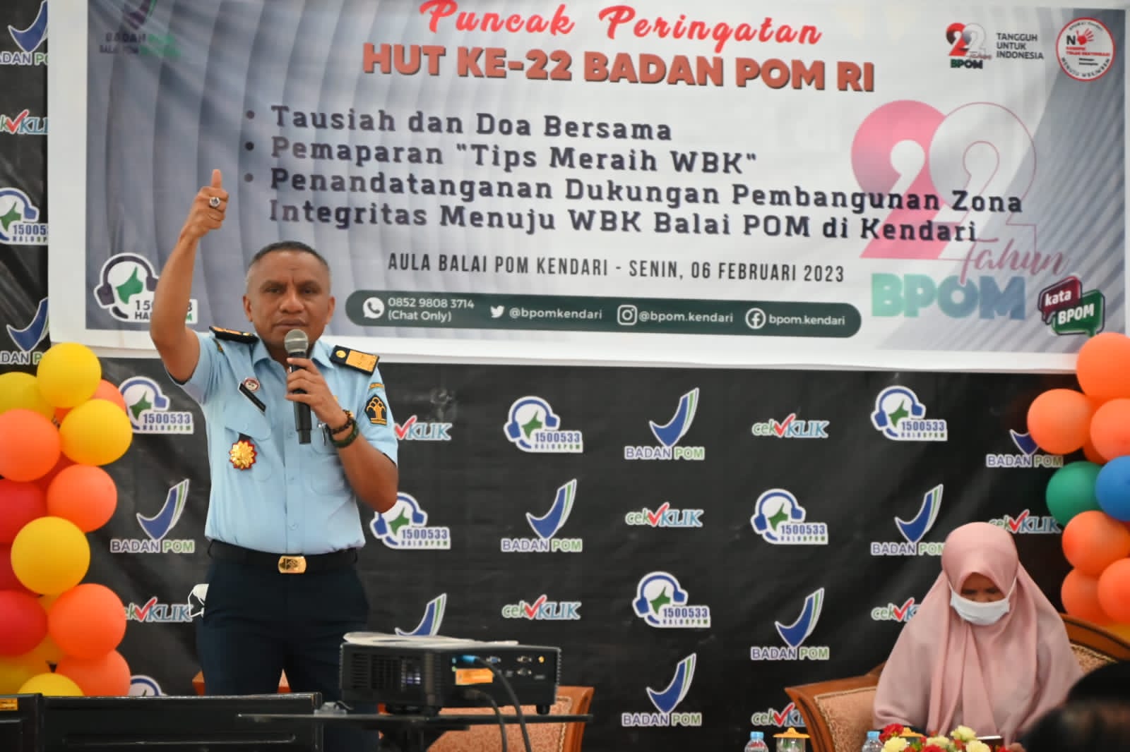 Berdasarkan hal itu, Kepala Kantor Wilayah Kementerian Hukum dan HAM Sulawesi Tenggara (Kakanwil Kemenkumham Sultra), Silvester Sili Laba, saat menghadiri perayaan HUT ke-23 BPOM RI di Kantor BPOM Kendari memberikan saran dalam upaya meraih predikat WBK.