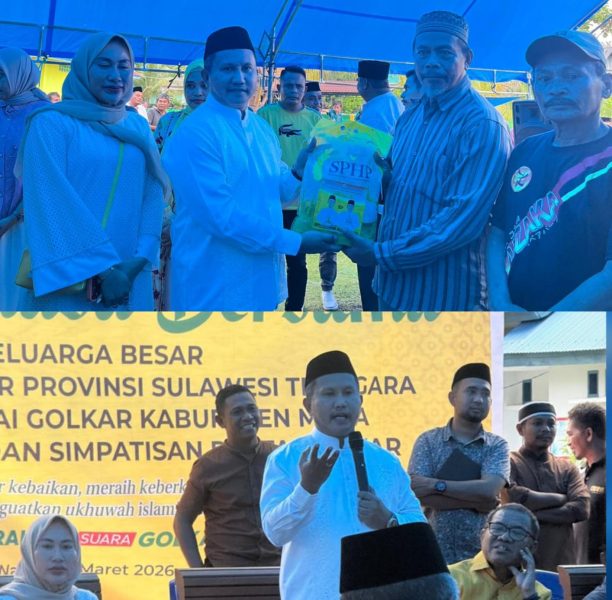 Dewan Pimpinan Daerah (DPD) Partai Golongan Karya (Golkar) Sulawesi Tenggara (Sultra) menggelar silaturahmi dan buka puasa bersama masyarakat Tongkuno Raya, Kabupaten Muna, Jumat, 13 Maret 2026. Kegiatan ini dirangkaikan dengan pembagian 500 paket beras kepada warga sebagai bentuk kepedulian di bulan Ramadan.