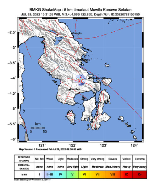 Gempa bumi tektonik berkekuatan 3,4 skala richter (SR) mengguncang wilayah Mowila Kabupaten Konawe Selatan, Jumat, 29 Juli 2022, pukul 16:31:56 WITa.