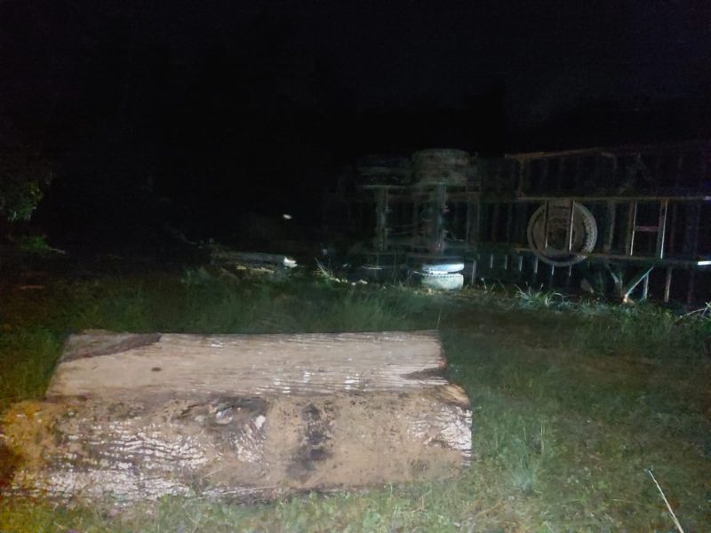 Namun saat proses pemuatan kayu bulat sudah mencapai sekitar 90 persen, tiba-tiba kayu penyanggah tiang jack kontainer patah sehingga kontainer terguling.