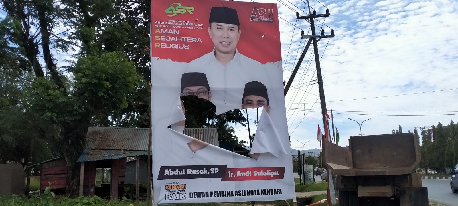 Sejumlah baliho milik pasangan bakal calon (Balon) Wali Kota Kendari, Abdul Rasak-Andi Sulolipu yang tersebar di beberapa titik di Kota Kendari diduga dirusak orang tak dikenal.