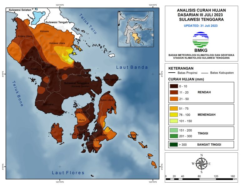 Ia melanjutkan, analisis curah hujan dasarian pada akhir Juli 2023 menunjukkan wilayah Sulawesi Tenggara secara umum mengalami curah hujan kategori rendah (0 – 50 mm/dasarian) hingga menengah (101-150 mm/dasarian).