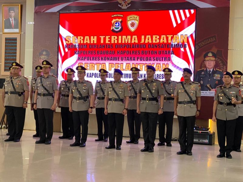 Empat pejabat utama (PJU) dan 5 Kapolres jajaran Polda Sultra melaksanakan serah terima jabatan antara lain Karo SDM, Dirlantas, Dirpolairud, Dansat Brimob, Kapolres Baubau, Kapolres Buton Utara, Kapolres Konawe Utara, Kapolres Kolaka Timur dan Kapolres Buton Tengah.