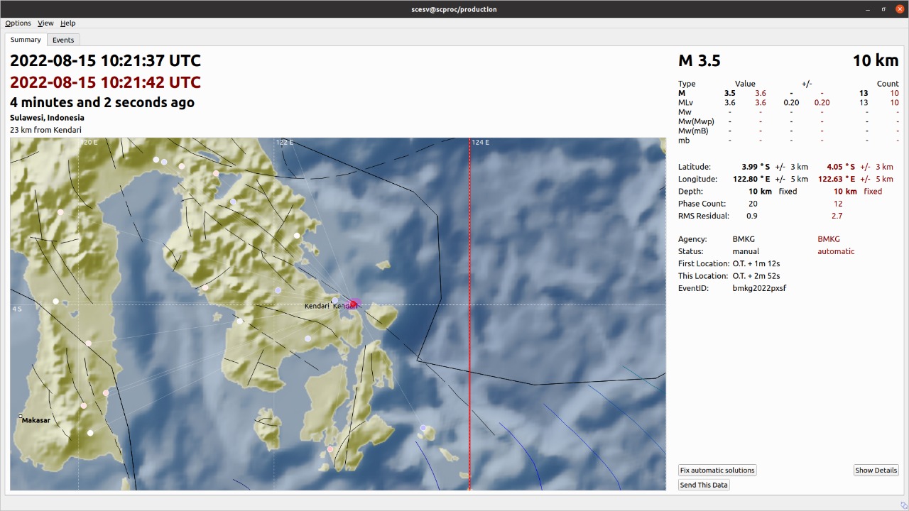 Gempa bumi tektonik berkekuatan 3,5 skala richter (SR) mengguncang wilayah Moramo Utara Kabupaten Konawe Selatan (Konsel), Senin, 15 Agustus 2022, pukul 18:21:37 WITa.