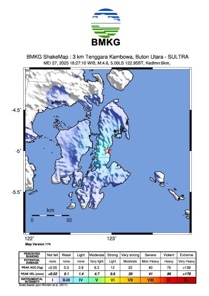 Gempa bumi tektonik berkekuatan 4,6 skala richter (SR) mengguncang wilayah Kambowa, Kabupaten Buton Utara (Butur), Selasa, 27 Mei 2025, pukul 19:27:11 WITa.