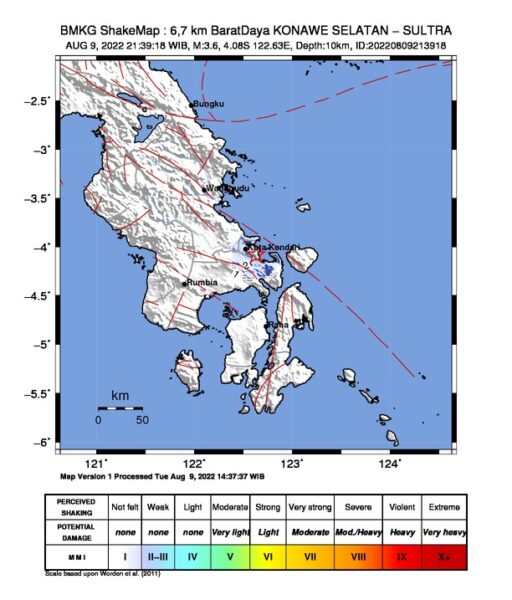 Gempa bumi tektonik mengguncang Kota Kendari Provinsi Sulawesi Tenggara, Selasa 9 Agustus 2022, pukul 22:39:18 WITa. Oleh Badan Meteorologi, Klimatologi dan Geofisika (BMKG) Kendari, gempa bumi ini tak berpotensi tsunami.