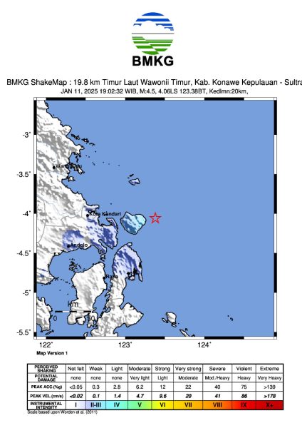 Gempa bumi tektonik berkekuatan 4,5 mengguncang wilayah Pulau Wawonii, Kabupaten Konawe Kepulauan, Sabtu, 11 Januari 2025, pukul 20:02:32 WITa.