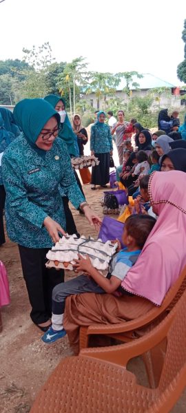 Ketua Tim Penggerak PKK Provinsi Sulawesi Tenggara Nur Endang Abbas bersama jajarannya menyerahkan bantuan bagi anak penderita gizi buruk di Kecamatan Soropia, Kabupaten Konawe, Sabtu 7 Januari 2022.
