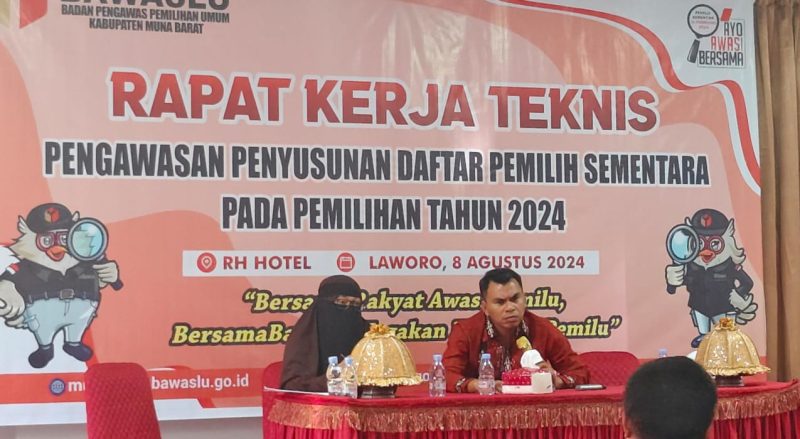 Badan Pengawas Pemilihan Umum (Bawaslu) Muna Barat (Mubar) menggelar rapat kordinasi dengan Panitia Pemilihan Kecamatan (PPK). Rapat tersebut bertujuan untuk menjaga hak pilih masyarakat yang memenuhi syarat agar terdaftar dalam daftar pemilih pada Pilkada Mubar 2024.