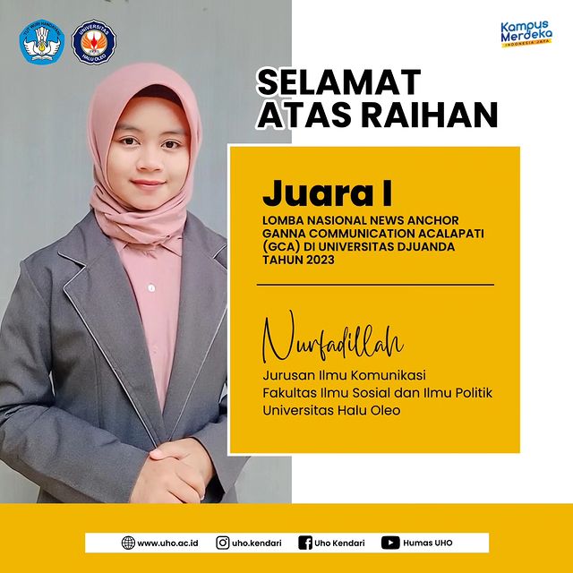 Kali ini Nurfadilla seorang mahasiswi dari program studi Ilmu komunikasi Jurusan Ilmu Komunikasi (IIkom) Fakultas Ilmu Sosial dan Ilmu Politik Universitas Halu Oleo (Fisip UHO).