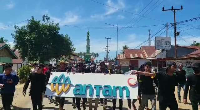 Tak hanya menyegel kantor, masyarakat juga mencopot papan nama PT Antam lalu diarak sepanjang jalan sembari mengucapkan kata “Lailahailallah” berulang kali.