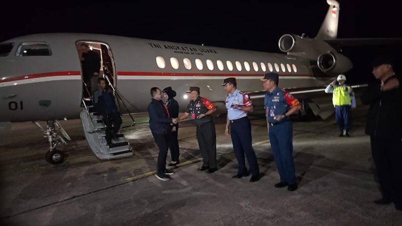 Jendral bintang 4 itu, tiba di Bandara Haluoleo Desa Ambaipua Kecamatan Ranomeeto Kabupaten Konawe Selatan Provinsi Sulawesi Tenggara pada pukul 18.10 WITa dengan menggunakan Pesawat Falcon 8x/A-0801.